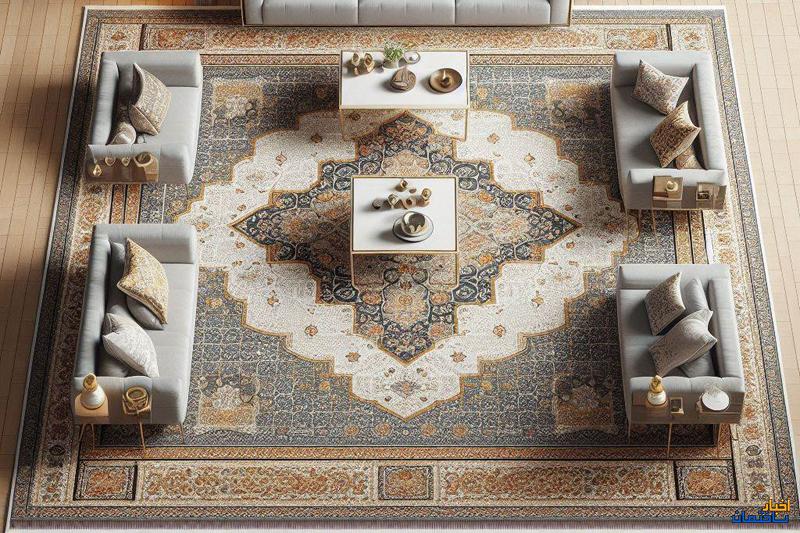 * فاصله مبلمان از فرش به یک اندازه باشد. مثلا، بین تمام پایه های مبل فاصله ای 10 سانتی متری لحاظ شود. چون در صورت عدم تعادل، سایز فرش مناسب خانه شما نبوده و برای فضایتان کوچک است.